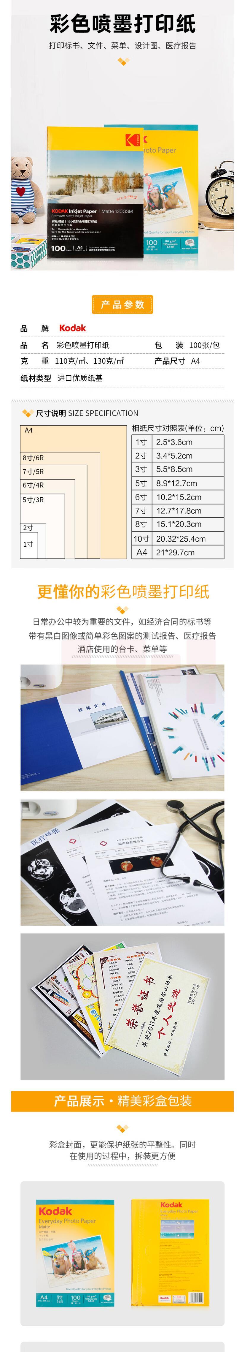 柯达Kodak A4 110g彩喷纸 哑光彩色喷墨打印纸 100张/包 货号:0029