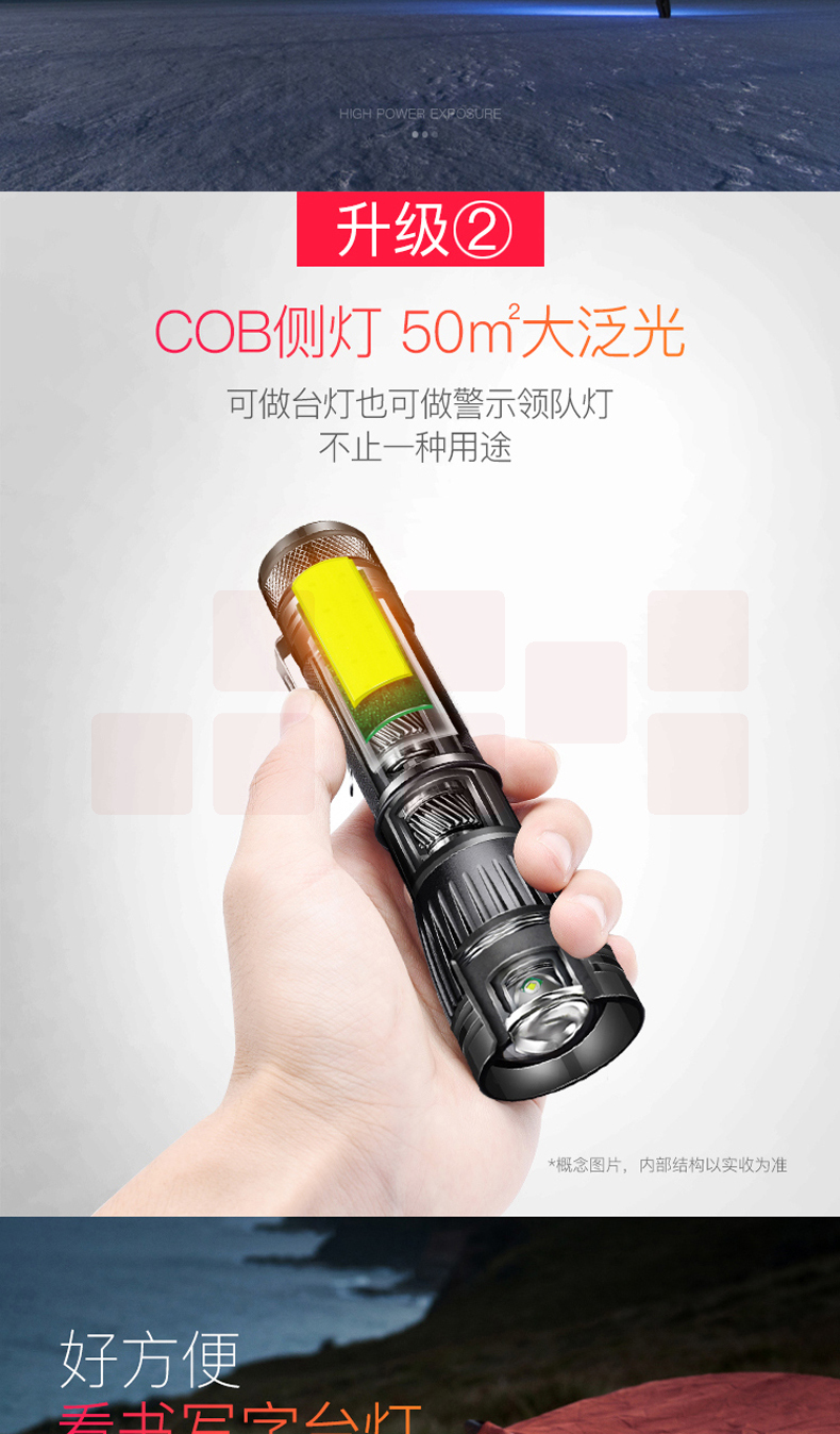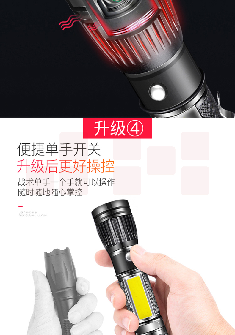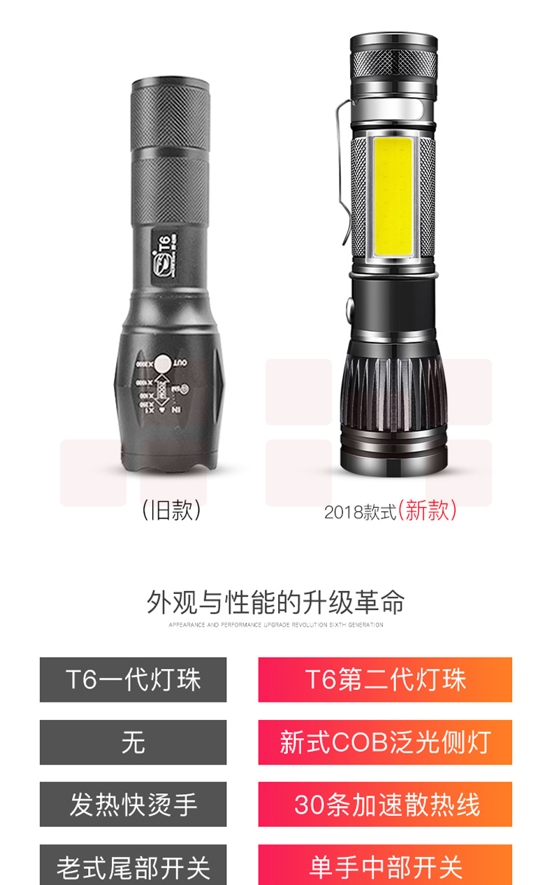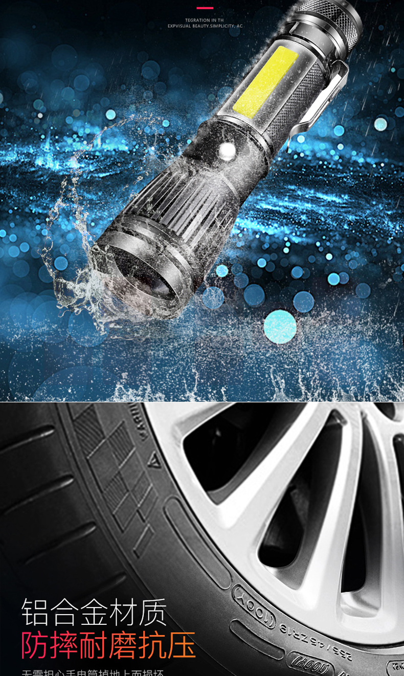 铝合金材质 强光-弱光-闪光 带侧灯 伸缩调焦 匹配18650电池