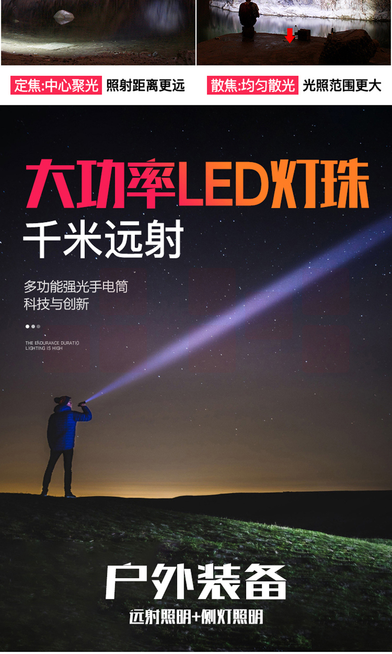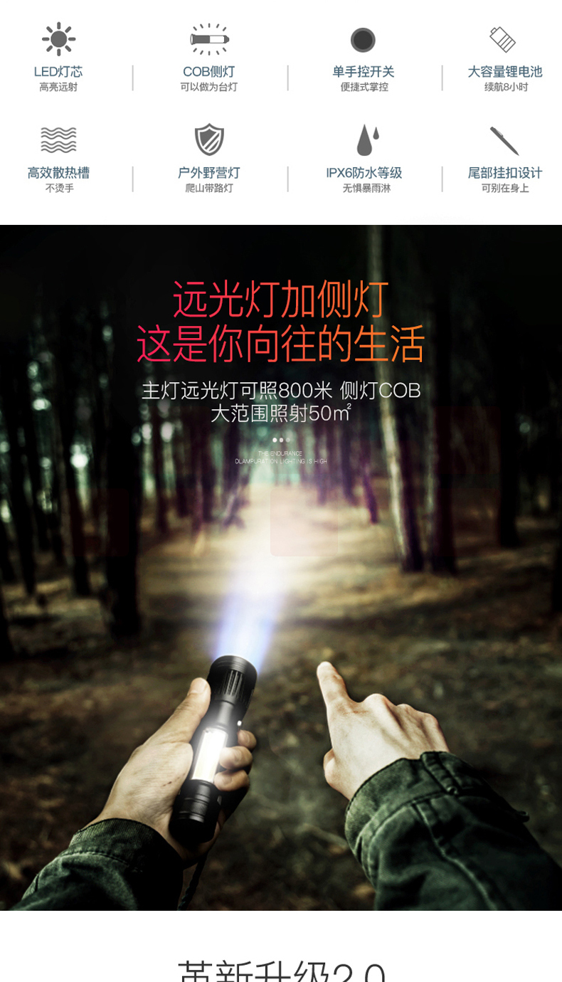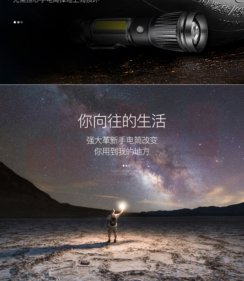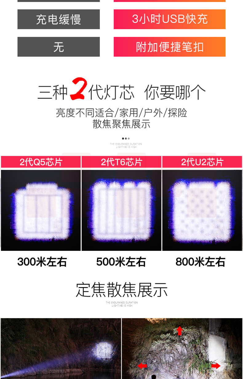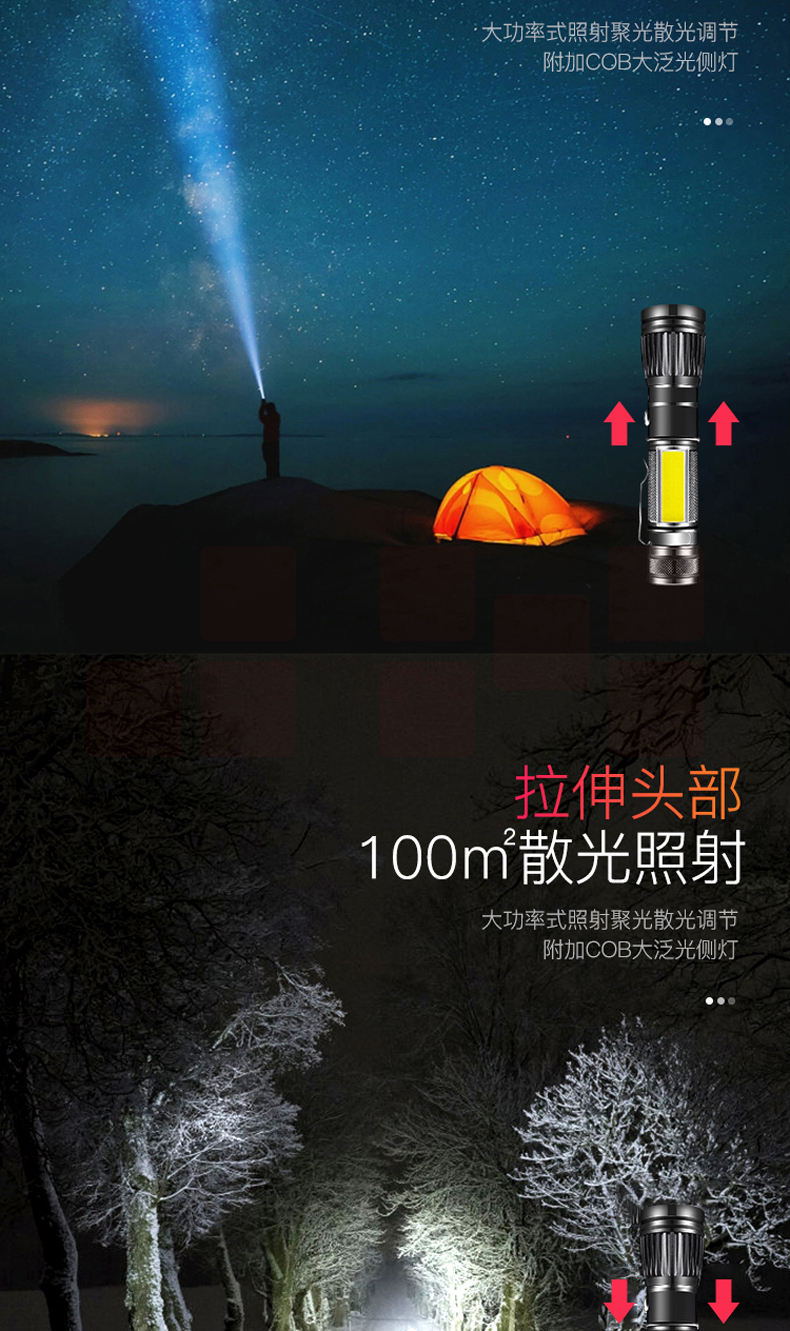 铝合金材质 强光-弱光-闪光 带侧灯 伸缩调焦 匹配18650电池