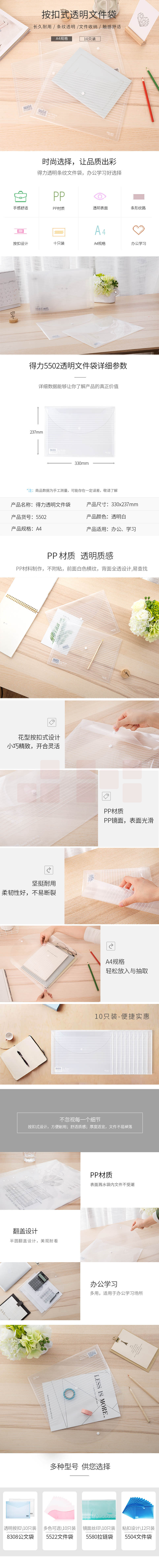 得力5502文件袋 A4加厚透明文件袋 按扣档案袋 防水资料袋