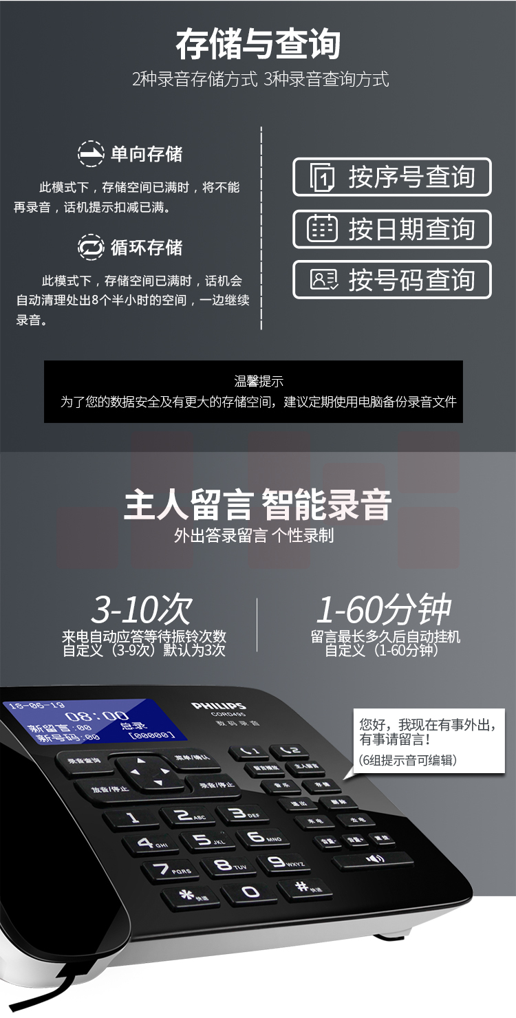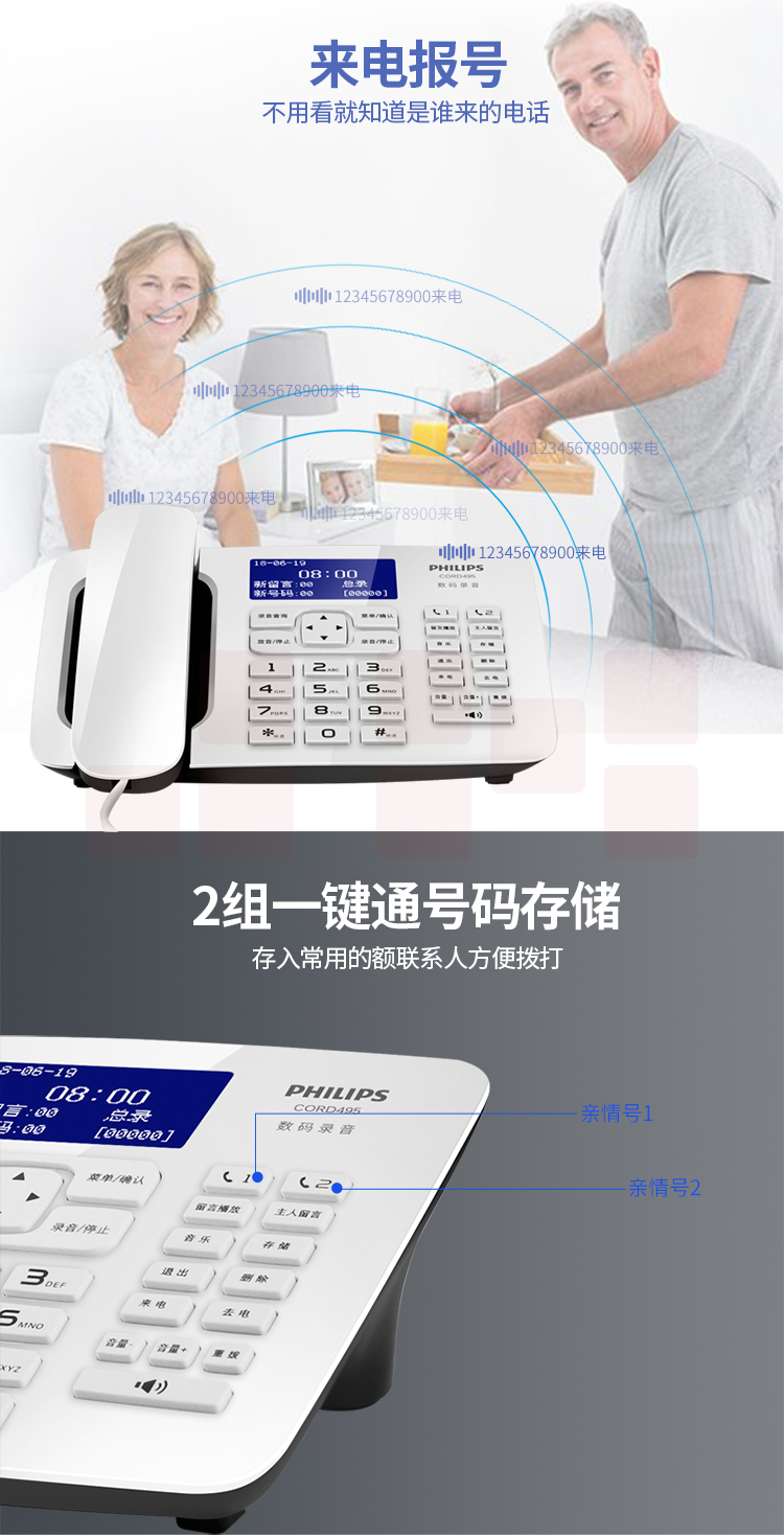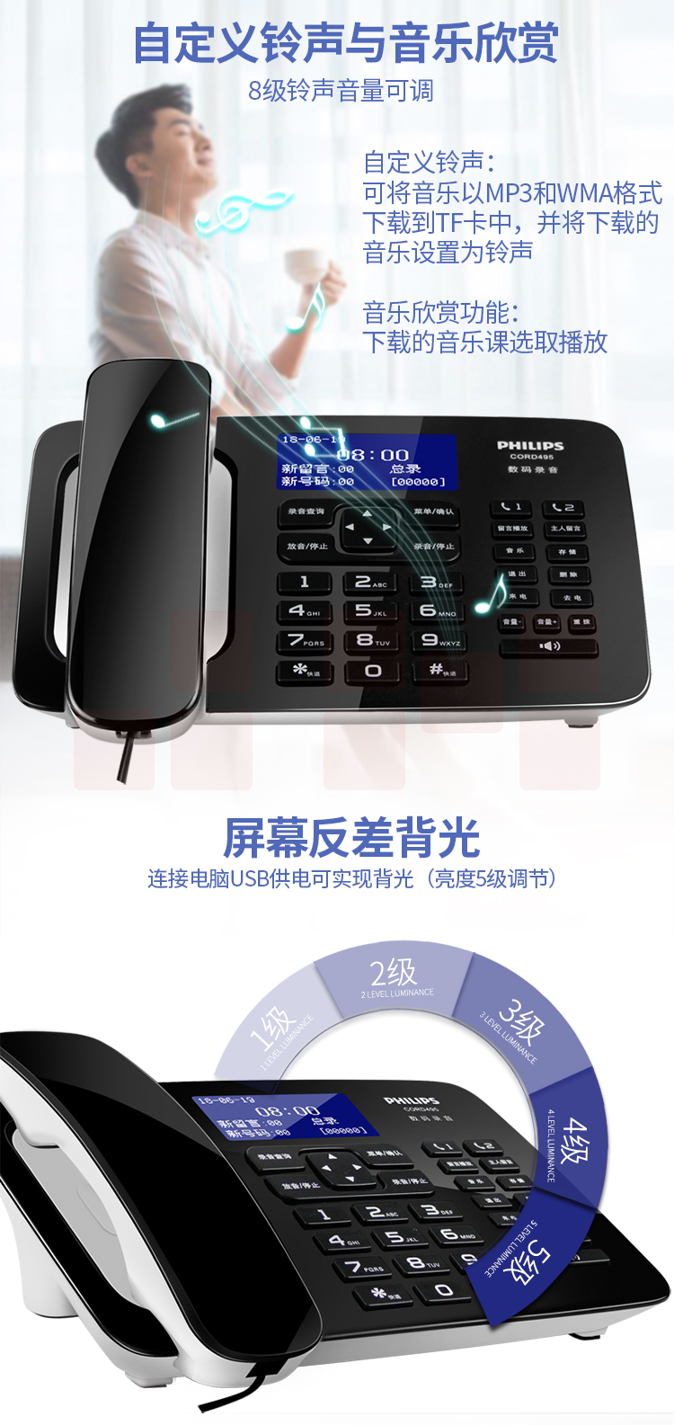 飞利浦(PHILIPS)录音电话机 固定座机 办公家用 中文菜单 自动录音 CORD495黑色