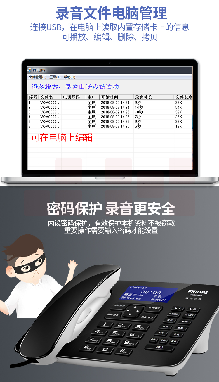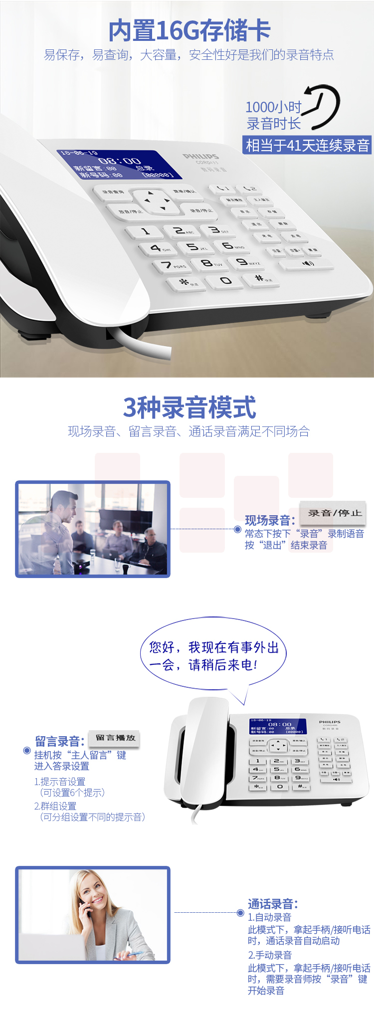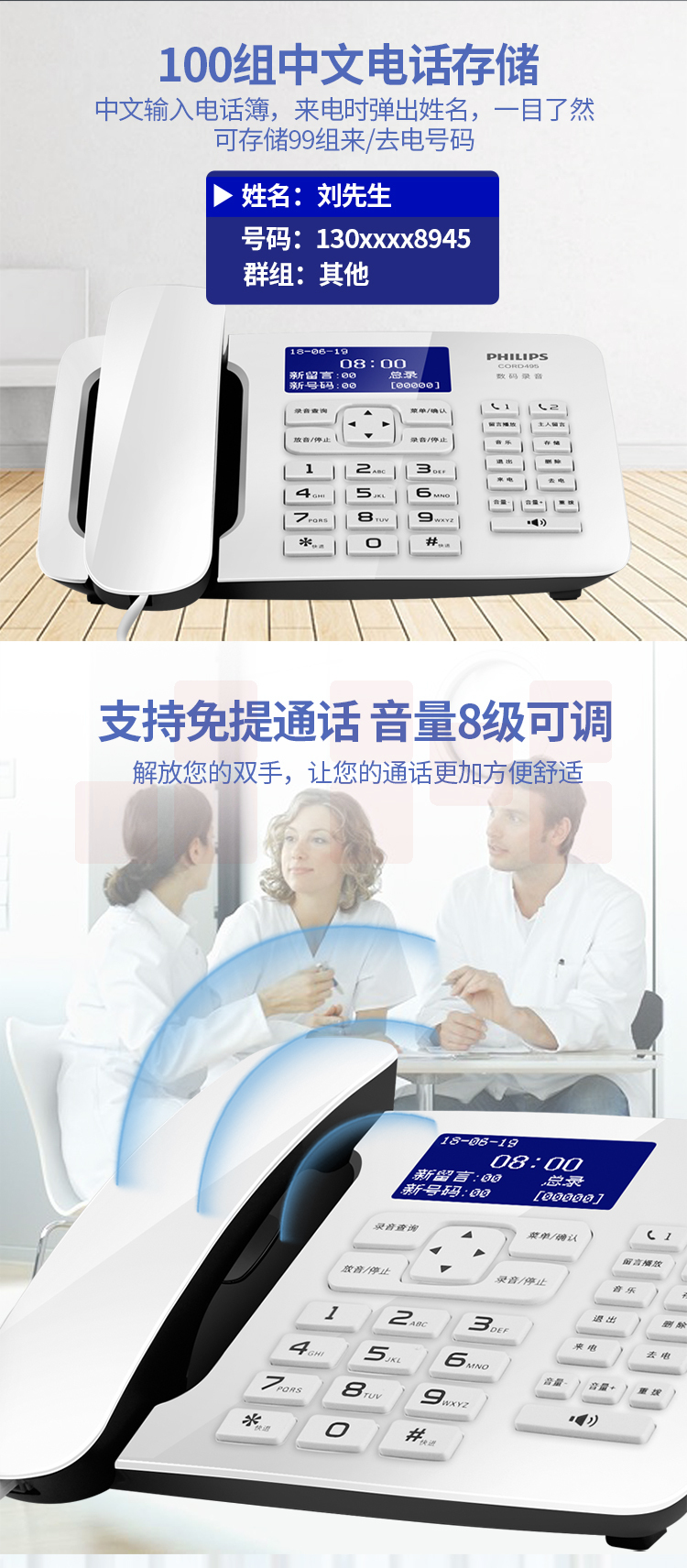 飞利浦(PHILIPS)录音电话机 固定座机 办公家用 中文菜单 自动录音 CORD495黑色