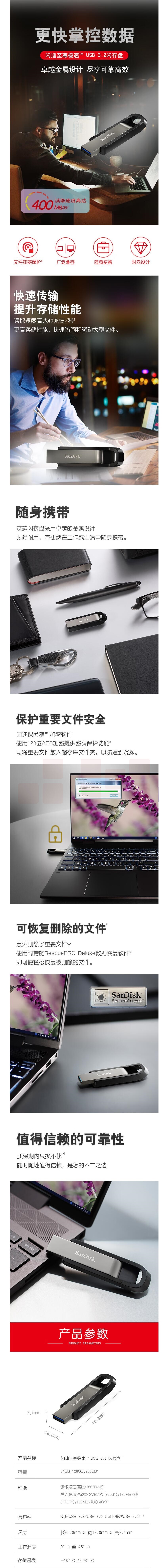 闪迪 256GB USB3.2至尊极速U盘 CZ810 读速400MB/s 写180MB/s