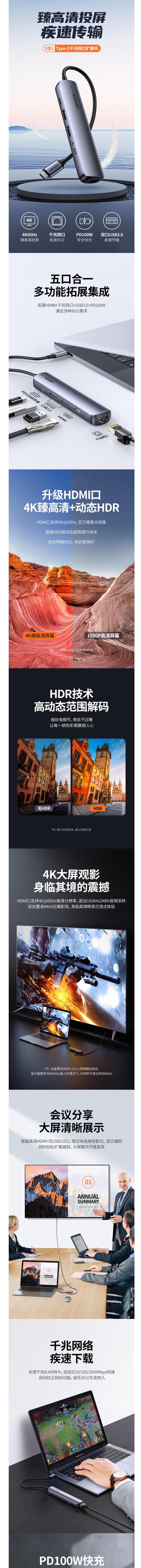 绿联 Type-C扩展坞 USB-C转HDMI转换器网口分线器 10919 货号:GD