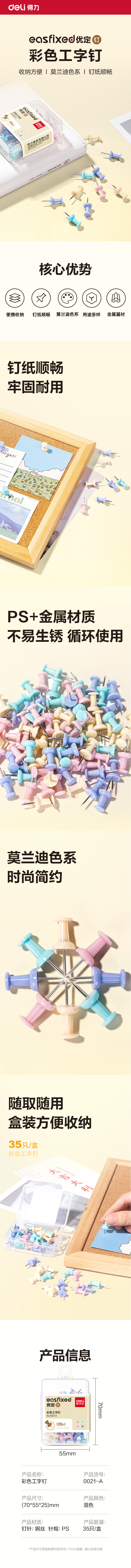 得力(deli)莫兰迪彩色工字钉 软木画板按钉 绘画图钉 可钉墙无痕泡钉 大头钉/照片钉 35枚/盒 0021-A