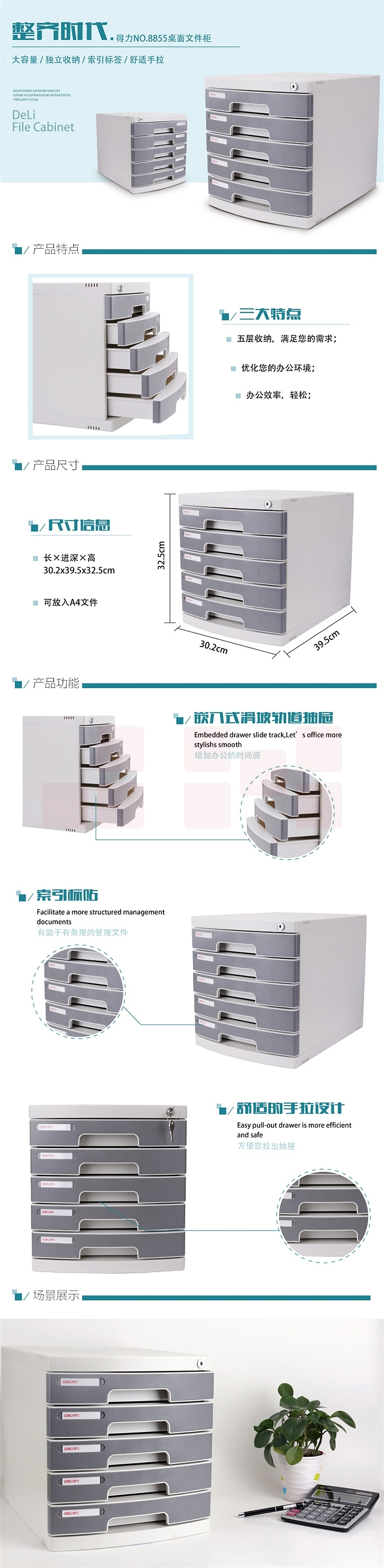 得力(deli)五层带锁桌面文件带锁抽屉收纳柜 8855
