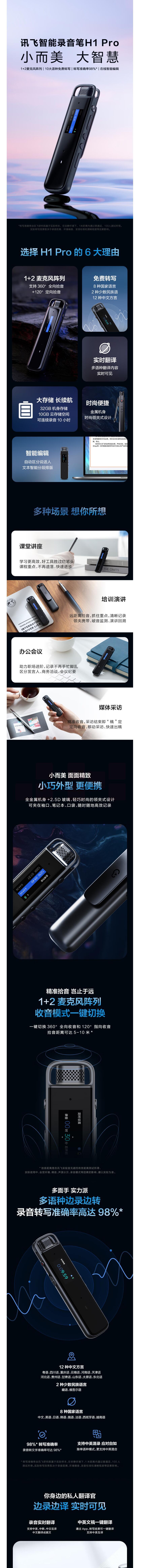科大讯飞 智能录音笔H1 Pro听见转写助手32G专业高清降噪会议录音转文字翻译 讯飞智能录音笔