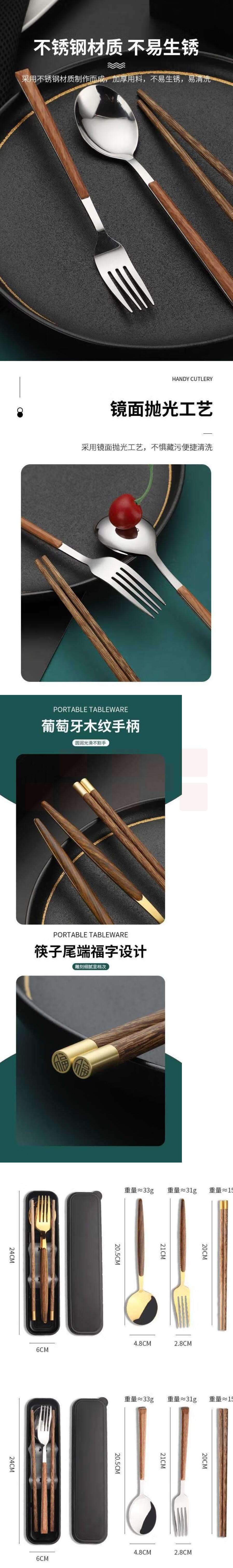 便携餐具筷子+不锈钢勺子套装 金色勺+筷子【带盒+袋子】不含叉子