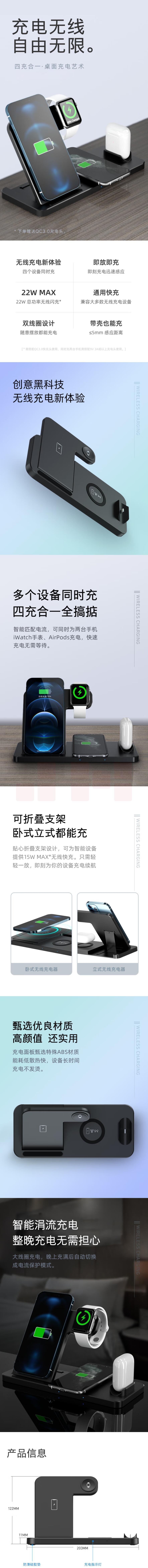 无线充电器快充桌面立式无线充电板底座耳机iwatch手表充电支架 【酷黑】四合一