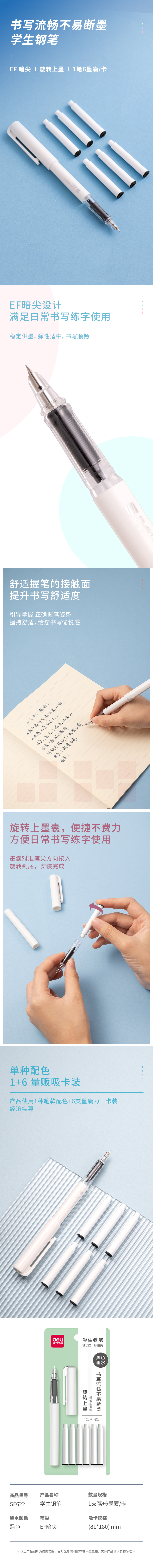 得力(deli)学生钢笔EF暗尖换墨囊钢笔墨水笔 黑 1笔+6墨囊/卡 SF622