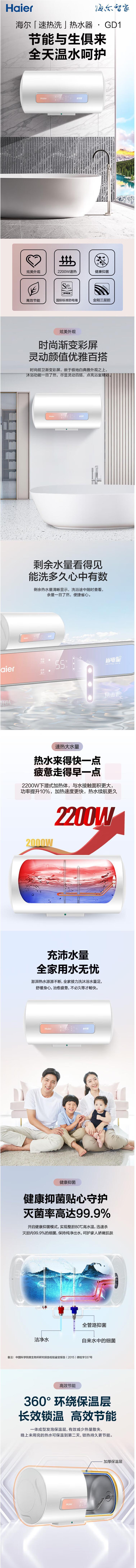 海尔 电热水器 速热大水量2200W加热触控按键ES60H-GD1(1) 60L