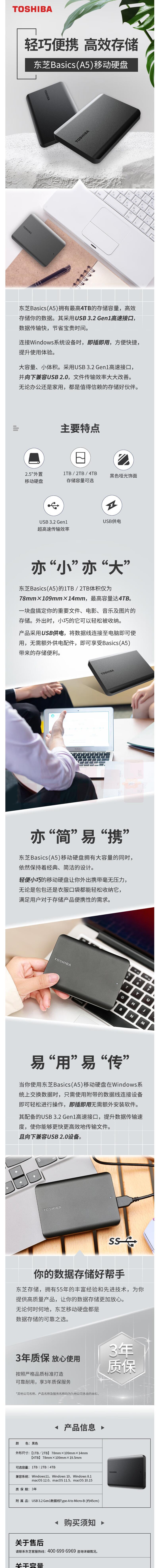 东芝 2TB 移动硬盘 新小黑A5 USB3.2 Gen 1 2.5英寸兼容Mac 数据存储 轻薄便携