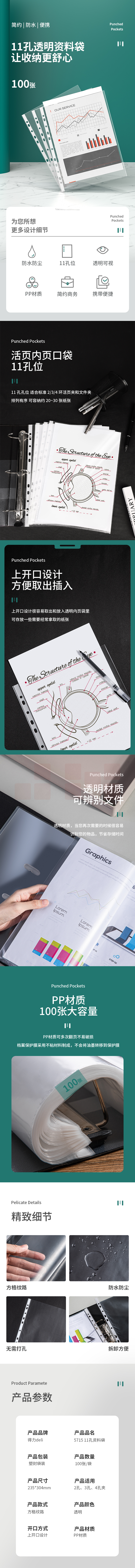 得力(deli)A4加厚活页夹文件打孔夹资料11孔内页袋 100只 细沙纹路5715