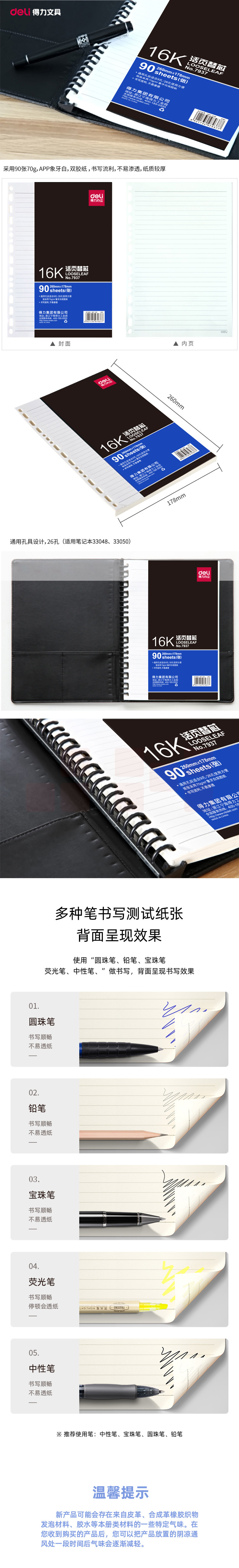 得力(deli)16K90张活页本册替芯26孔记事本笔记本子内页 7937