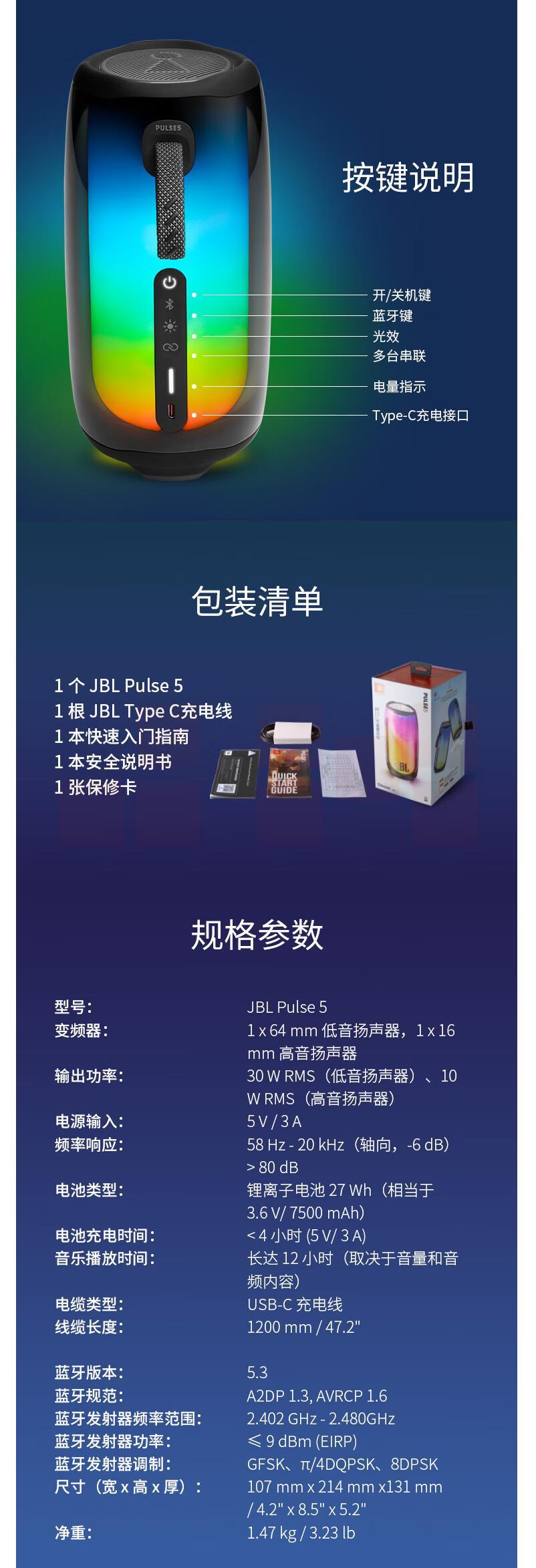 JBL PULSE5 音乐脉动五代 便携式蓝牙音箱 全面屏炫彩小音箱 低音炮 桌面音响 防水防尘 货号:WY
