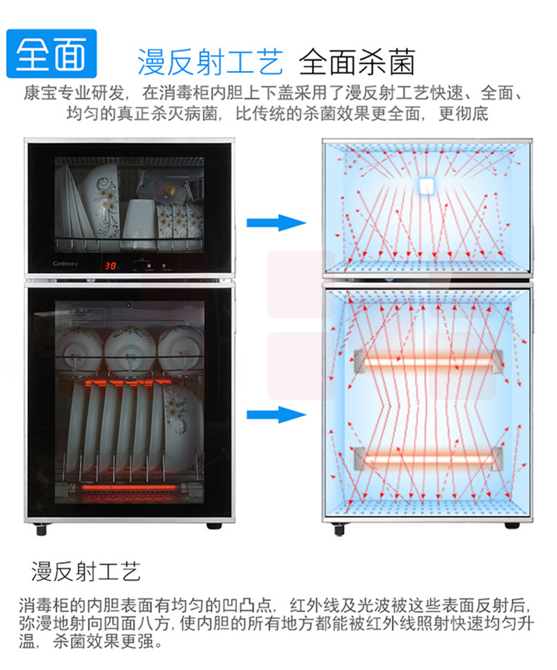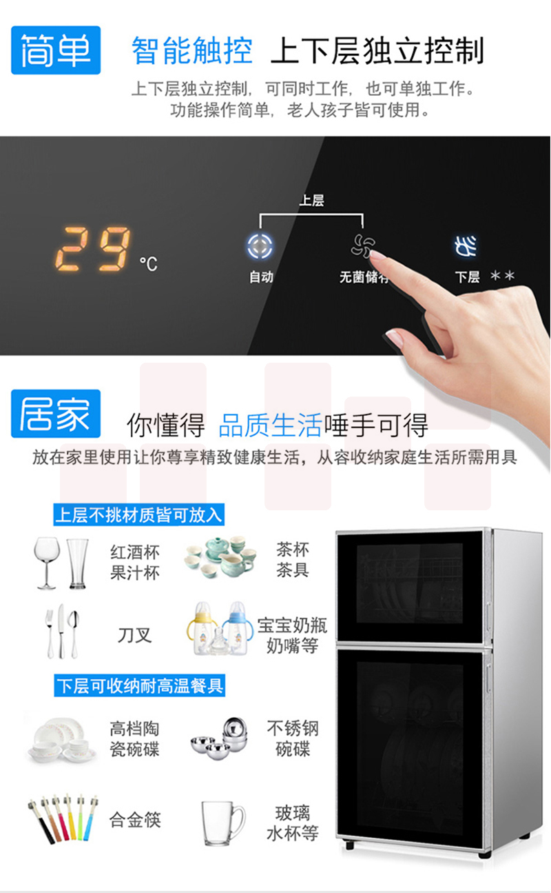 1、尺寸:425*358*800(ZTD80K-2U) 220V-50Hz 700W2、容积(L):80L3、消毒方式及使用场所:4、上层24小时无菌储存,快速除菌器+中温烘干;下层高温消毒5、内胆采用矩形式半球凸点技术,利用漫反射原理,实现360度杀菌无死角6、电脑数码触摸屏幕,带温度显示7、多用途不锈钢层架,碗筷摆放更轻松