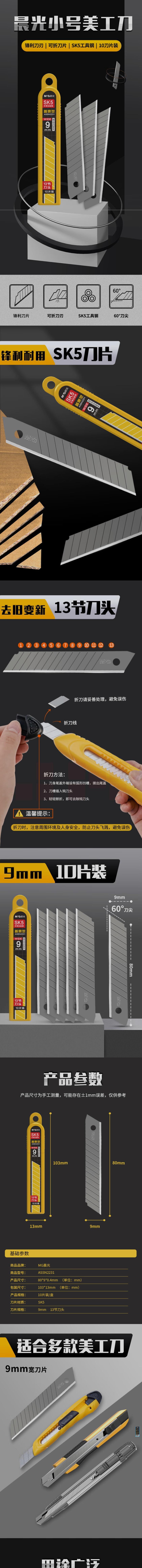 晨光 9mm小号美工刀片 13刀头SK5合金钢刀片/替换刀片 10片/盒 ASSN2231