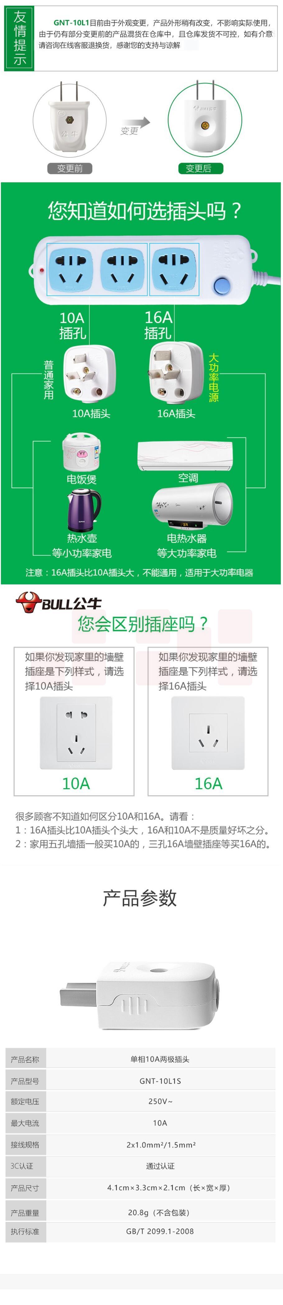 公牛插头 10A 二脚插头 电源插头GN-10L1S