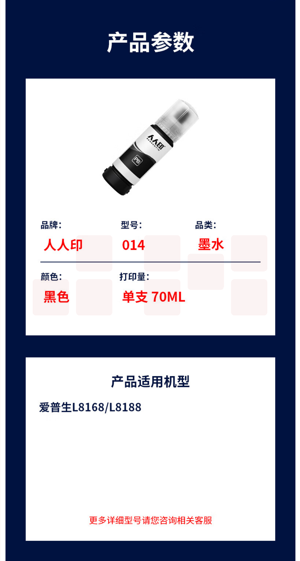 人人印 014PB照片黑色墨水适用爱普生墨水Epson L8168打印机墨水L8188