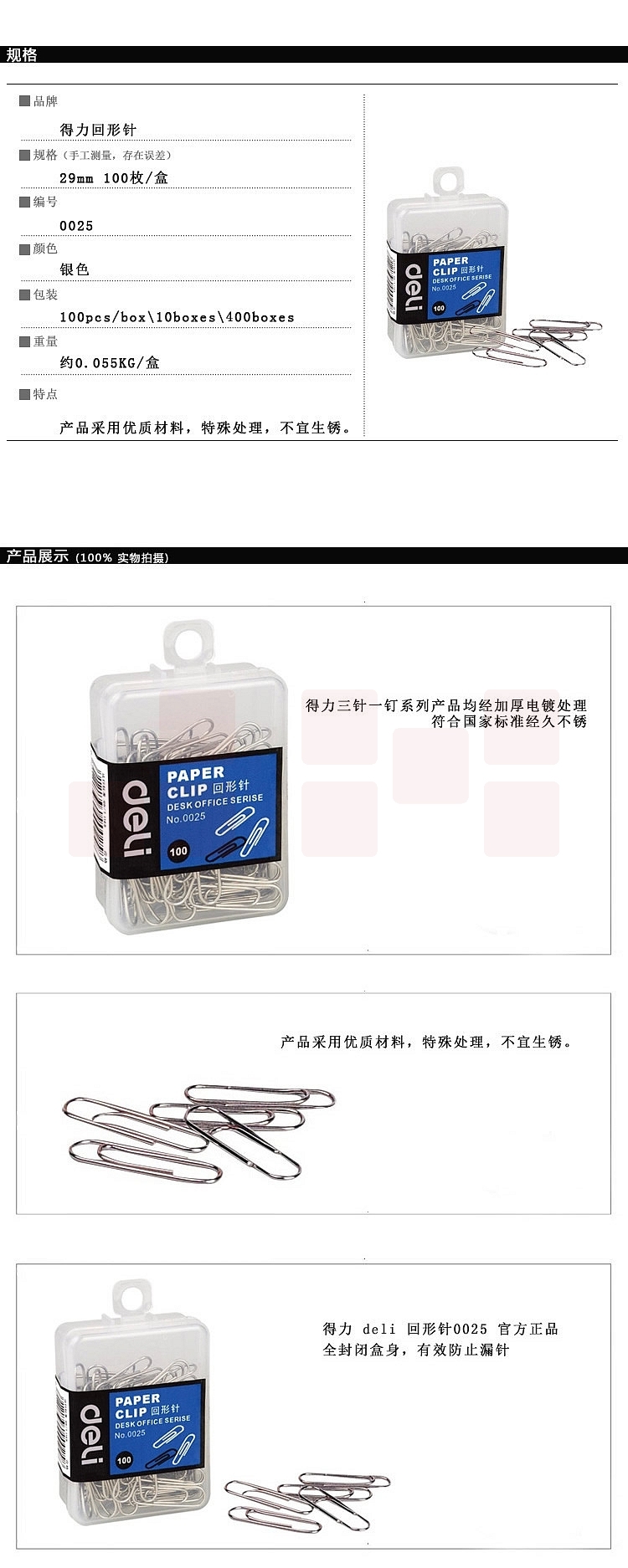 得力(deli)29mm镀镍回形针 3#金属防锈曲别针 100枚/盒 0025