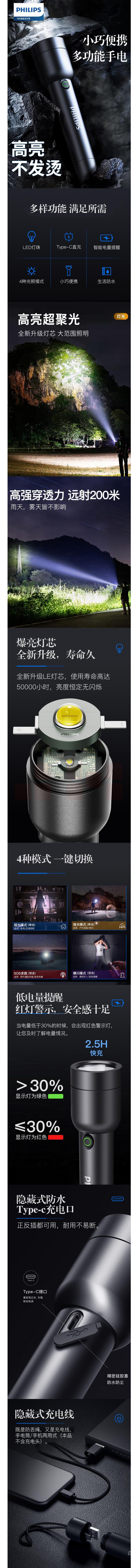 飞利浦 手电筒强光手电 Type-C充电多功能手电筒 SFL1236黑色 Y