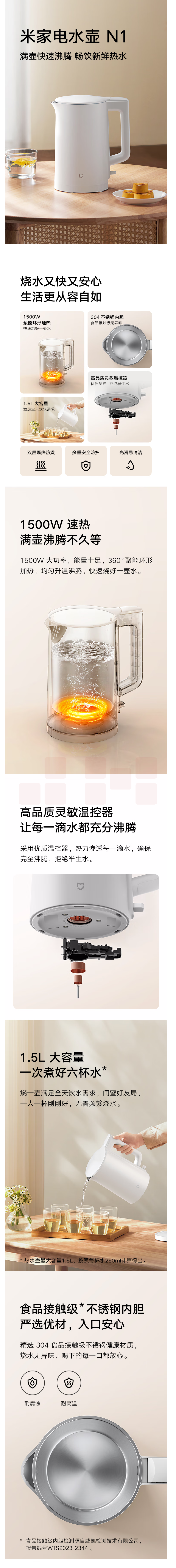 小米 1.5L电水壶 304不锈钢 1500W快速加热 自动断电 N1