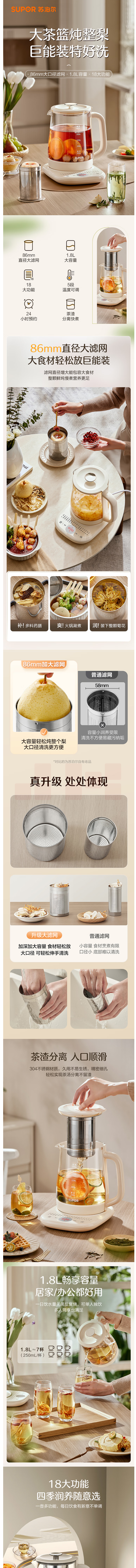 苏泊尔(SUPOR)SW-18YJ15A 1.8L 养生壶 煮茶器 花茶壶电茶壶 304不锈钢 玻璃面板带滤网 货号:JC