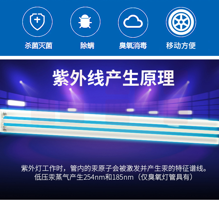 有臭氧紫外线杀菌灯,臭氧具有强氧化作用,可有效地杀灭细菌,臭氧的弥散性恰好可弥补由于紫外线只沿直线传播、消除有死角的缺点。室内无人时使用,开灯时避免直视灯光,消完毒需要开窗透风,每次杀毒不超过30分钟。
