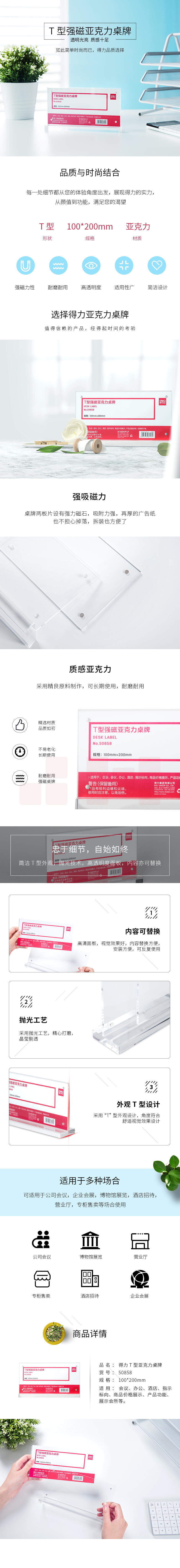 得力(deli)T型200*100mm高档亚克力强磁桌牌 会议牌席卡桌签三角台卡/展示牌 座位牌50858