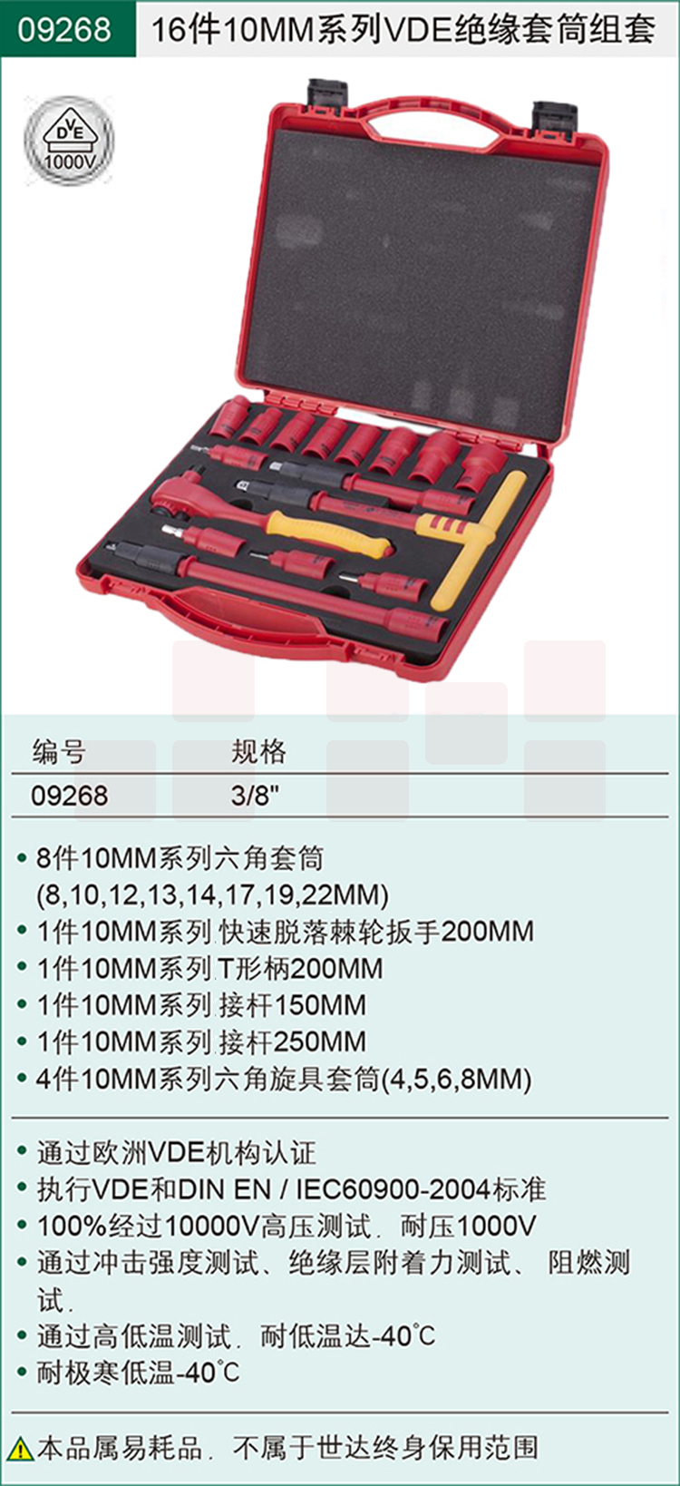 世达(SATA)16件10MM系列VDE绝缘套筒组套货号09268