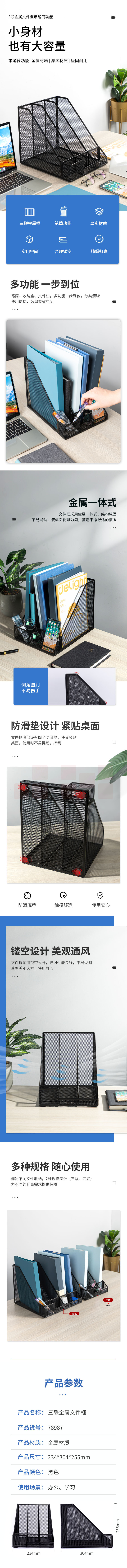 得力(deli)三联带笔筒金属文件框书立架收纳盒多层资料架网状镂空文件架 78987