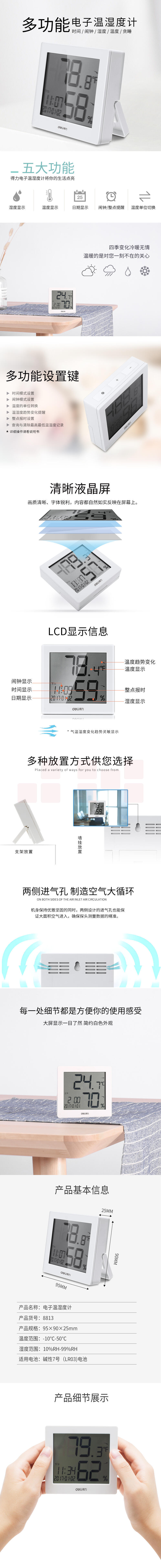得力(deli)LCD带时间闹钟电子温湿度计 浴室婴儿房温度湿度监测 8813