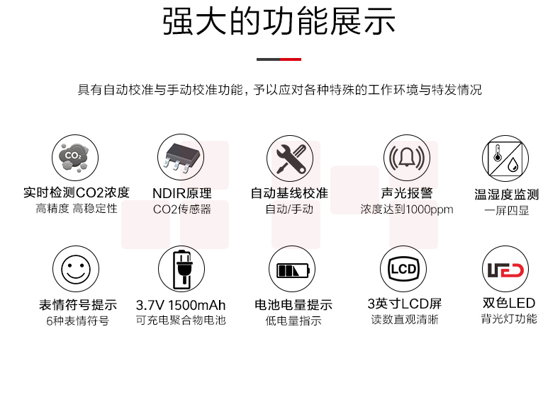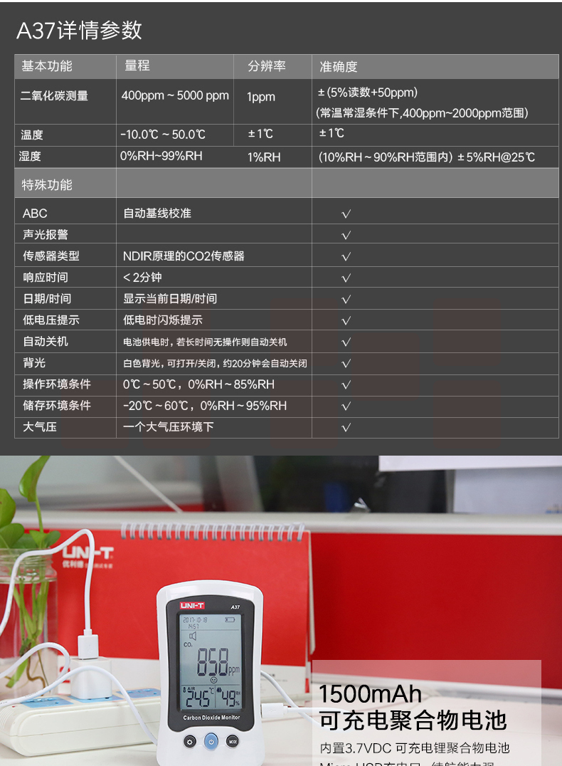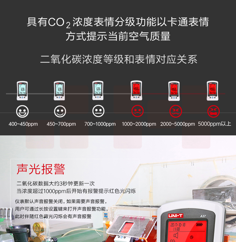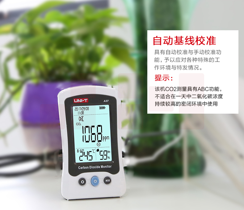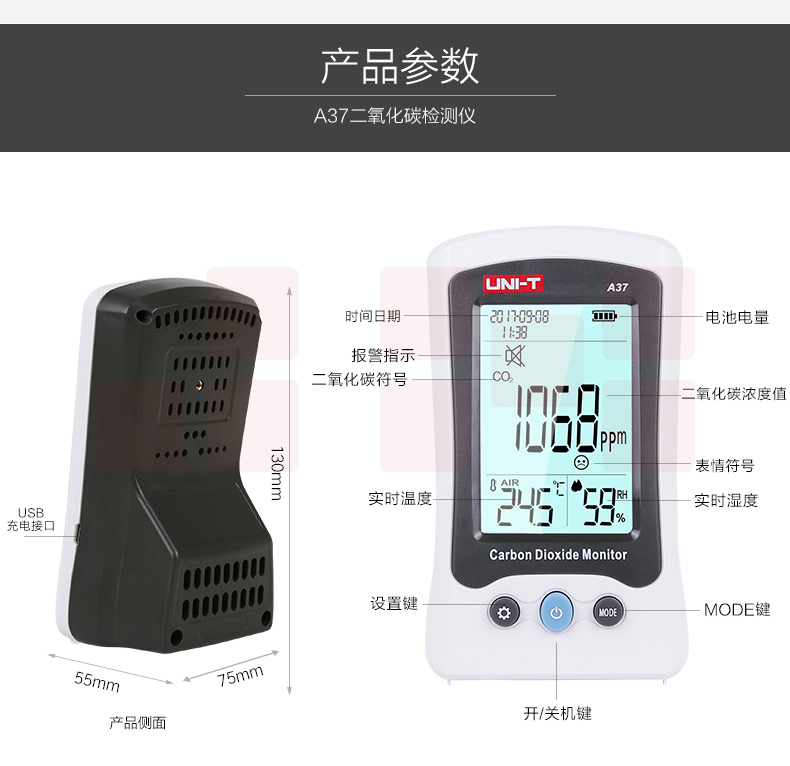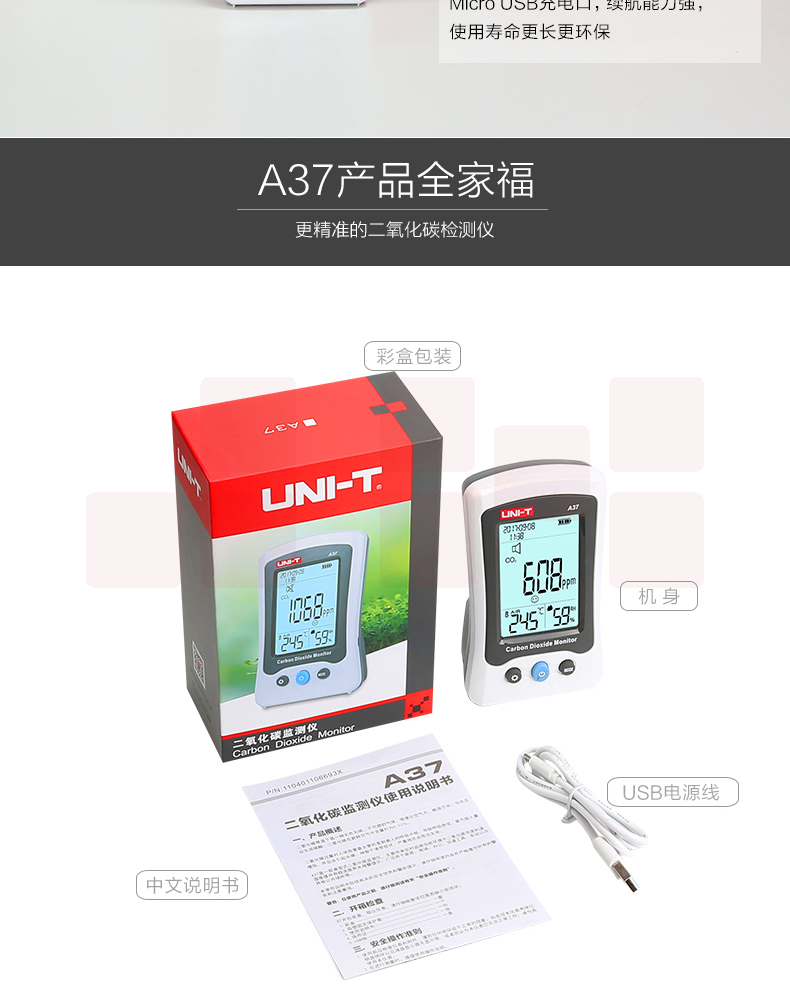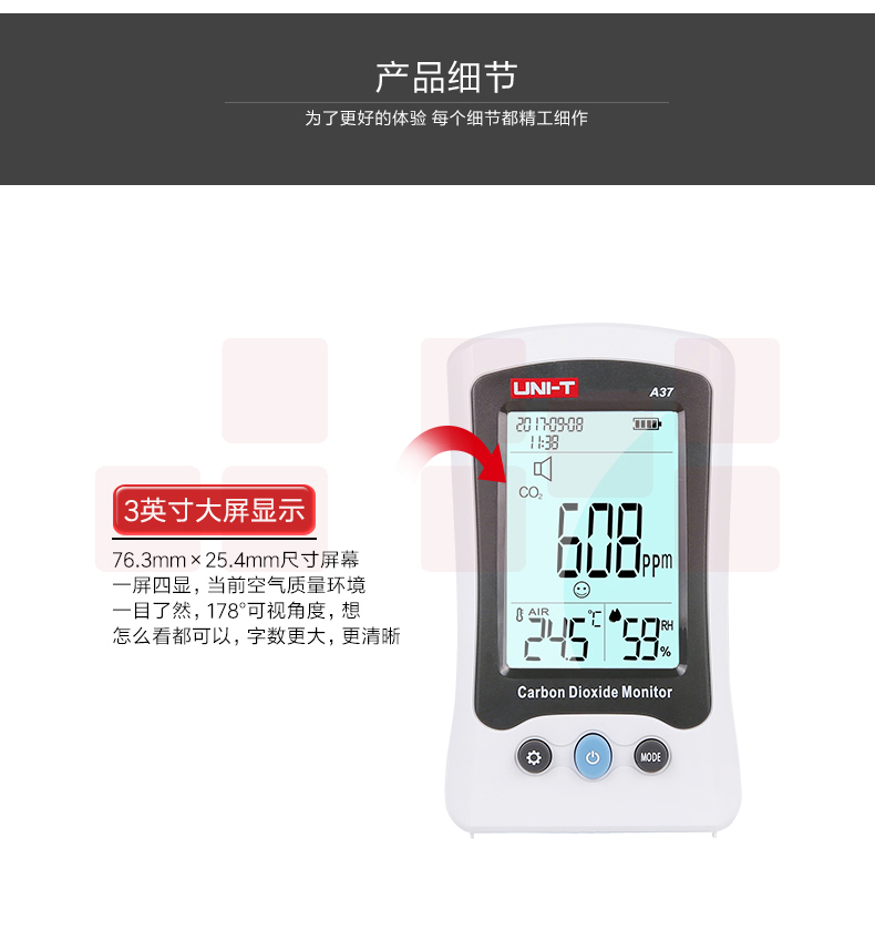 优利德(UNI-T)二氧化碳检测仪 空气质量激光测试仪CO2监测 (温度/湿度/二氧化碳浓度) A37