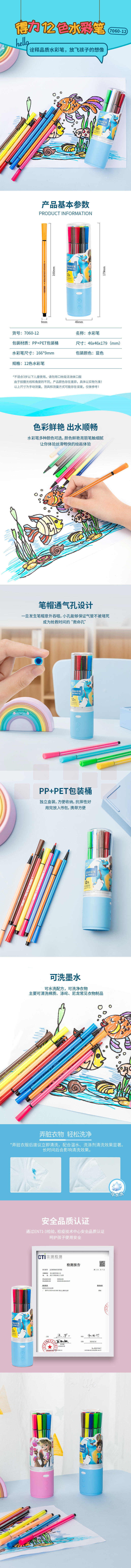 得力 7060-12色 细六角杆水彩笔 桶装