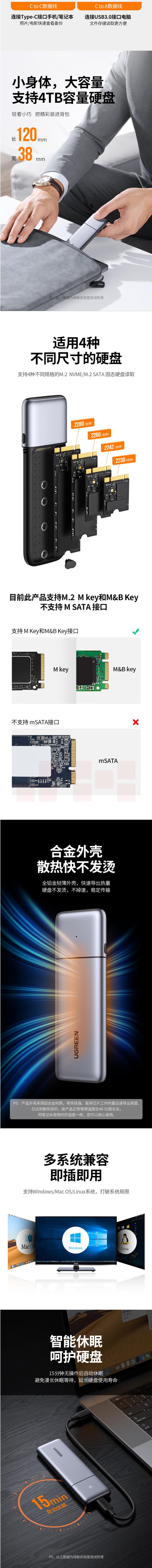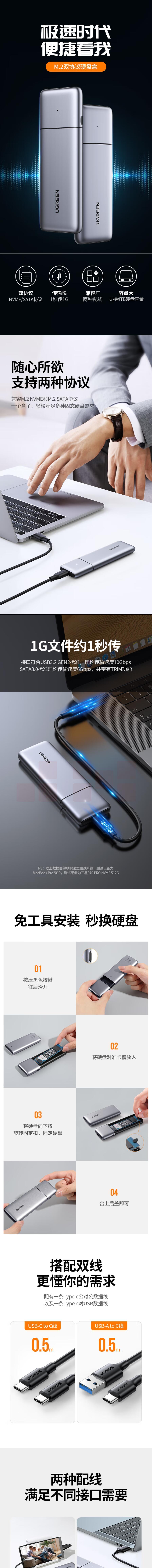 绿联 M.2 NVMe/SATA移动硬盘盒 Type-C3.2接口SSD固态硬盘盒子笔记本电脑M2双协议外置全铝外壳80863