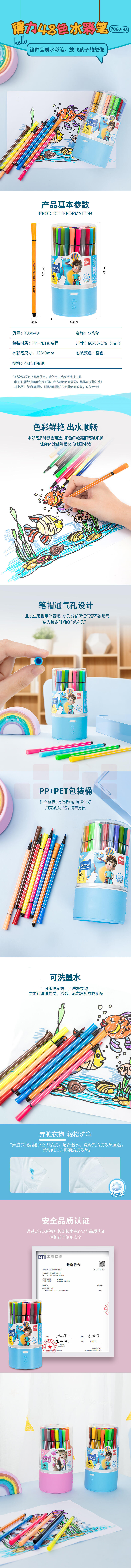 得力 7060-48色 细六角杆水彩笔 筒装