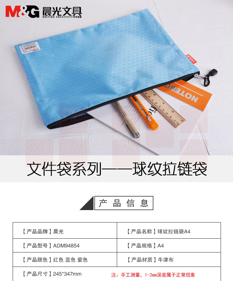 晨光 A4球纹拉链袋文件袋ADM94854 红蓝紫颜色随机