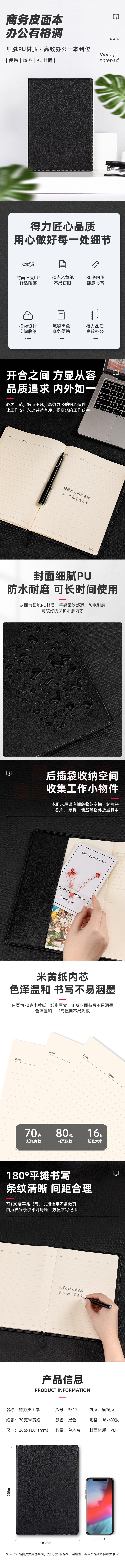 得力(deli)16K/80张商务办公笔记本子 记事本会议皮面本办公用品 黑色3317
