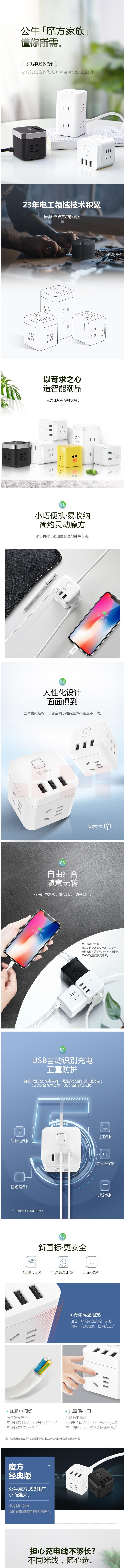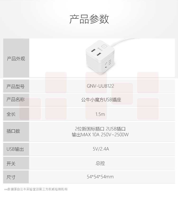 公牛 小魔方USB插座 插线板/插排/排插/接线板 2孔+2USB口全长1.5米 GNV-UUB122