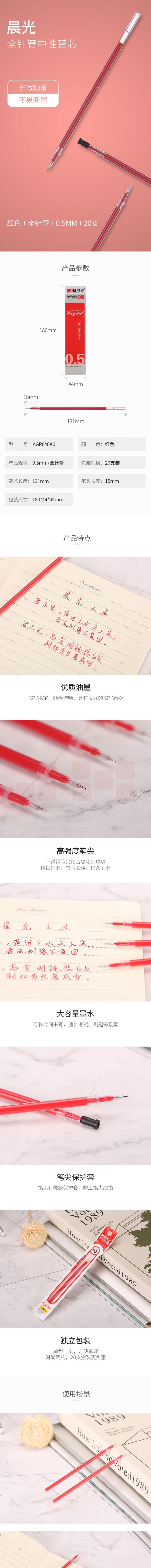 晨光(M&G)0.5mm红色中性笔芯 全针管签字笔替芯通用水笔芯 20支/盒AGR640K0C