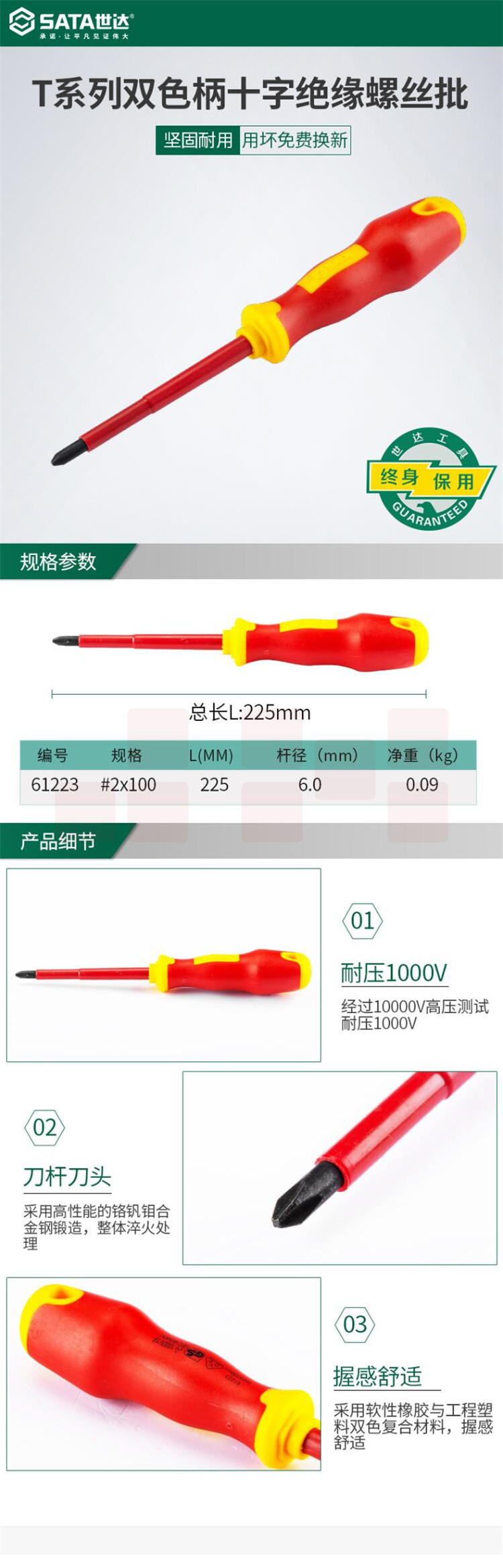 世达(SATA)T系列双色柄十字绝缘螺丝批#0x60MM 61221