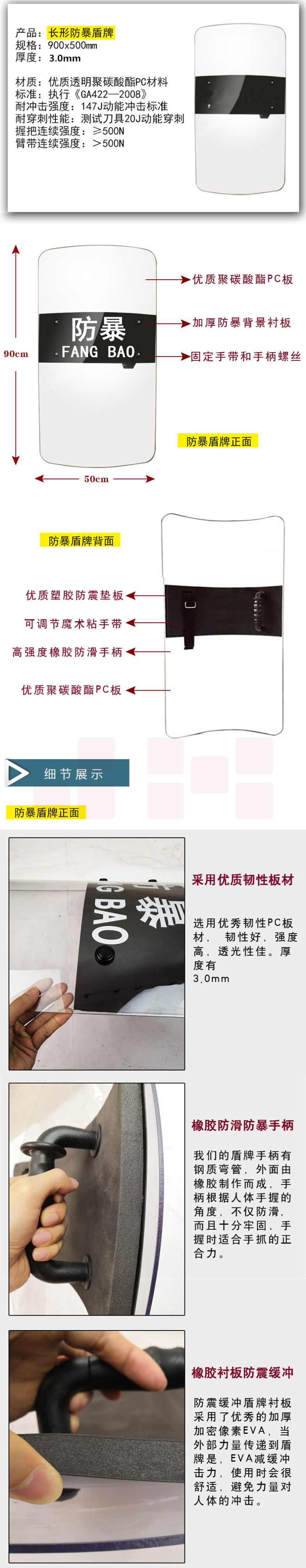 PC防爆盾牌防暴盾牌手持盾牌校园安保器材900*500mm