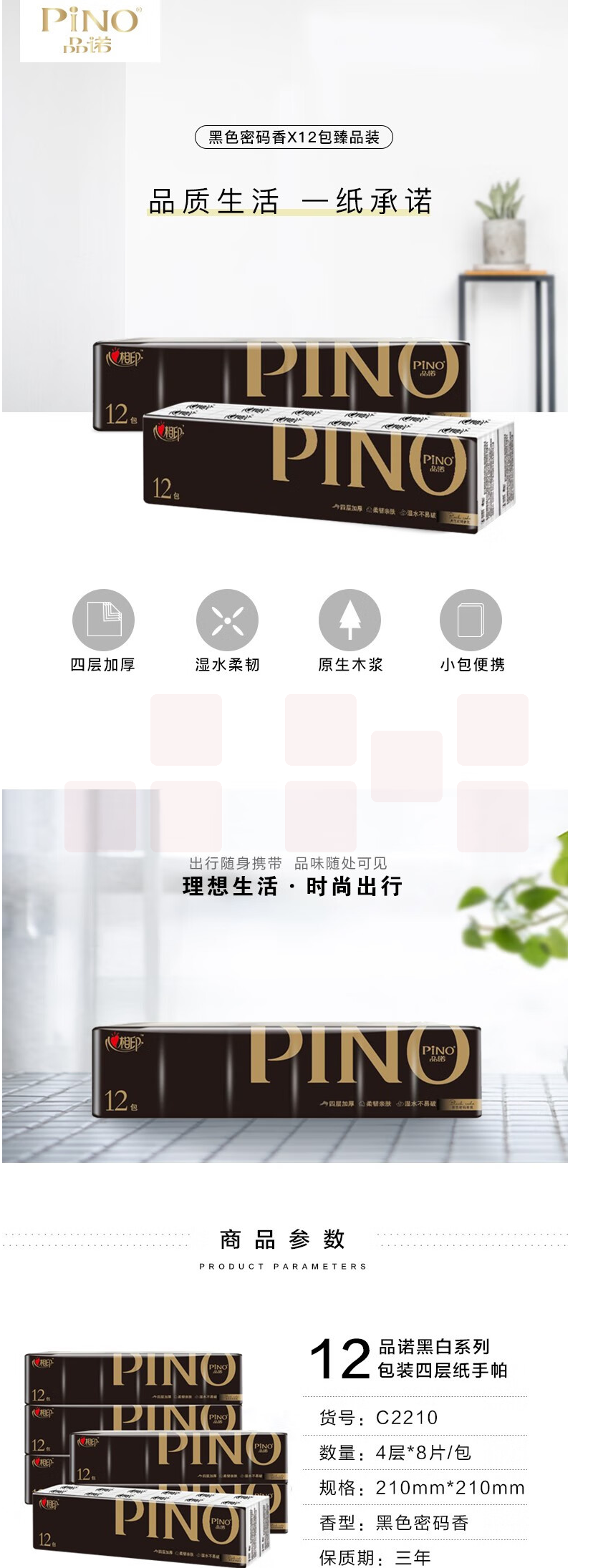 心相印 品诺黑白系列手帕纸4层8张12包装(C2210) 4层8张12包装 货号:LJ