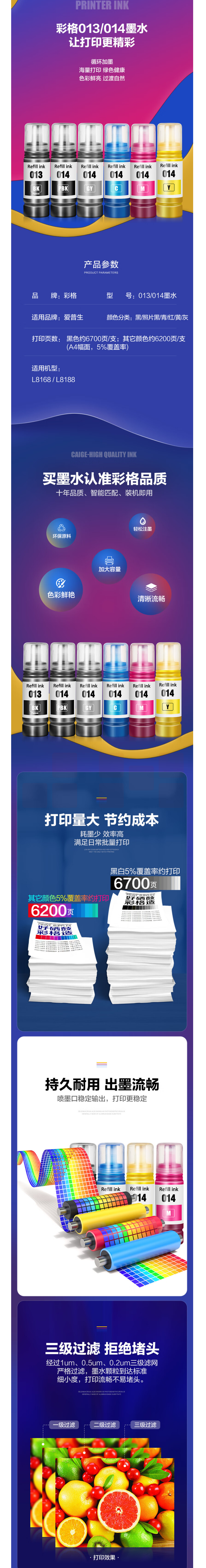 彩格013/014墨水六色套装 适用爱普生打印机Epson L8168 L8188墨水(013BK/014PB/014C/014M/014Y/014GY)