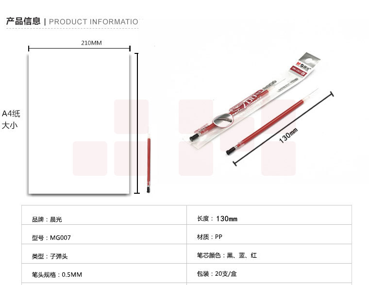 晨光 中性笔笔芯全针管替芯 拔帽签字笔芯钻石水笔芯 黑色 0.5mm子弹头MG007A 20支/包