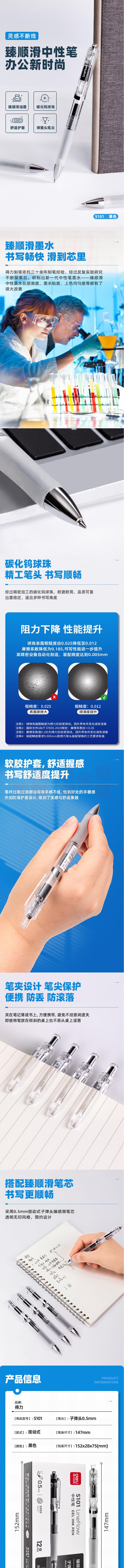 得力(deli)臻顺滑中性笔 0.5mm子弹头签字笔无印风按动中性笔 黑色12支/盒 S101