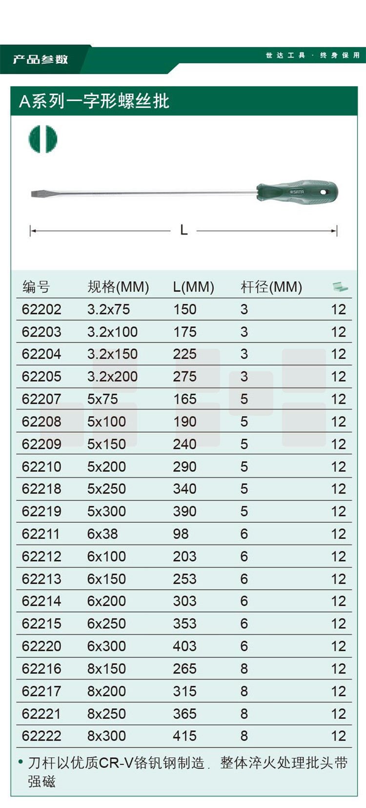 世达 62213 一字形螺丝刀6x150MM 一字改锥