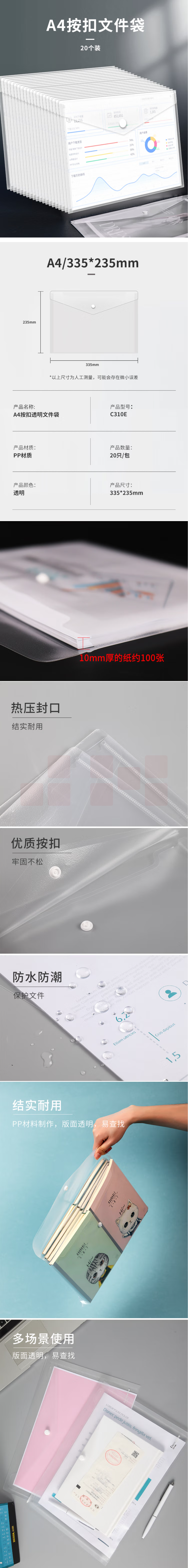 齐心 A4按扣透明文件袋 防水档案袋资料袋C310E 10个装
