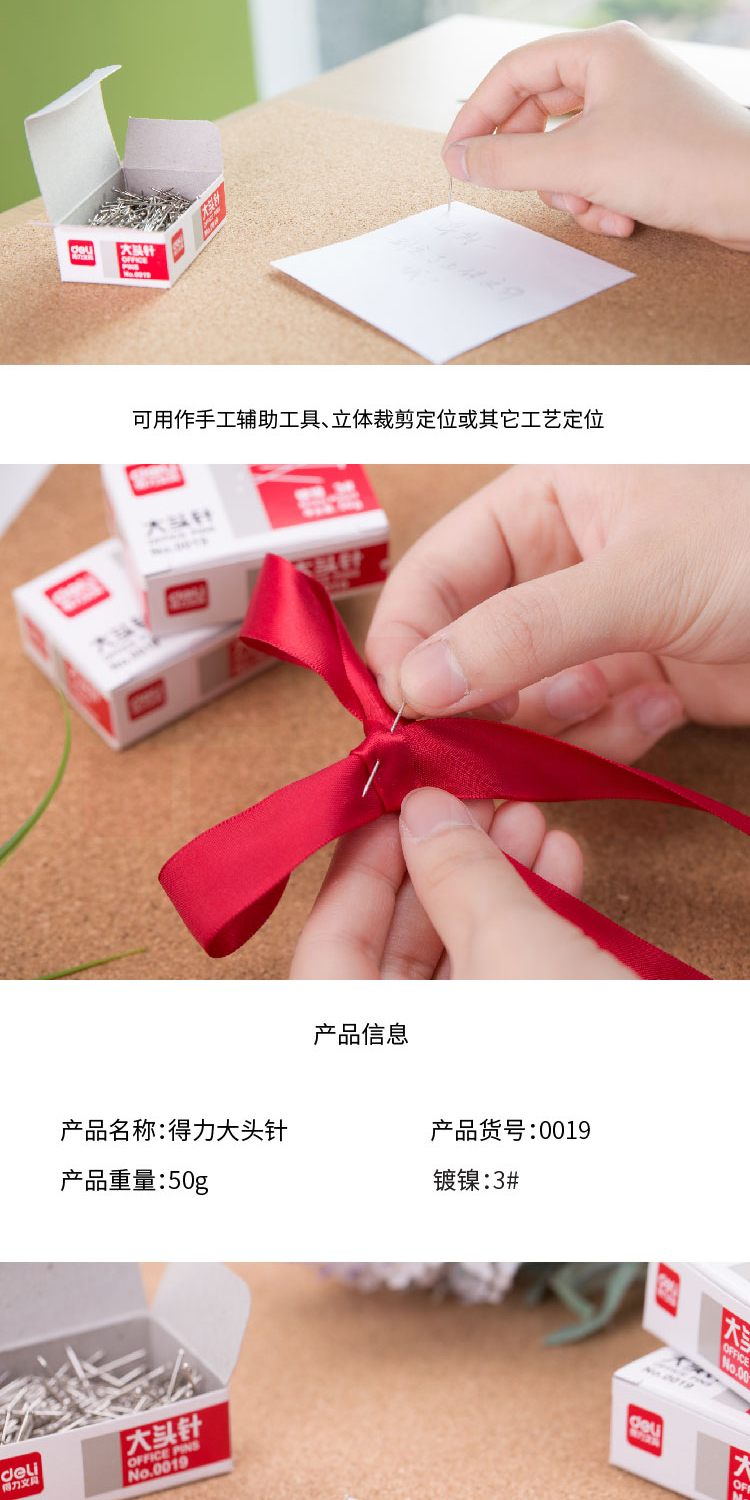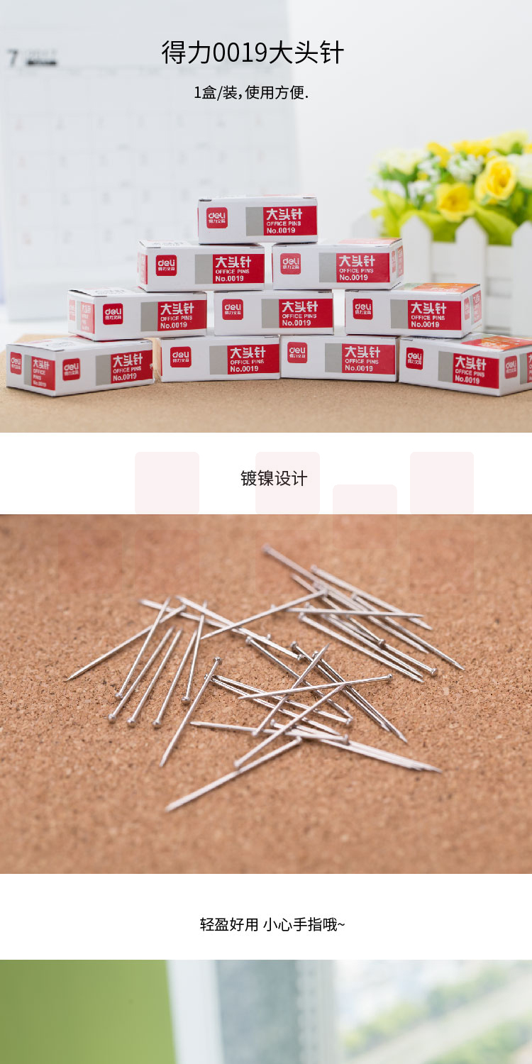 得力(deli)3#27mm大头针直别针 服办公固定针(50克/盒) 0019