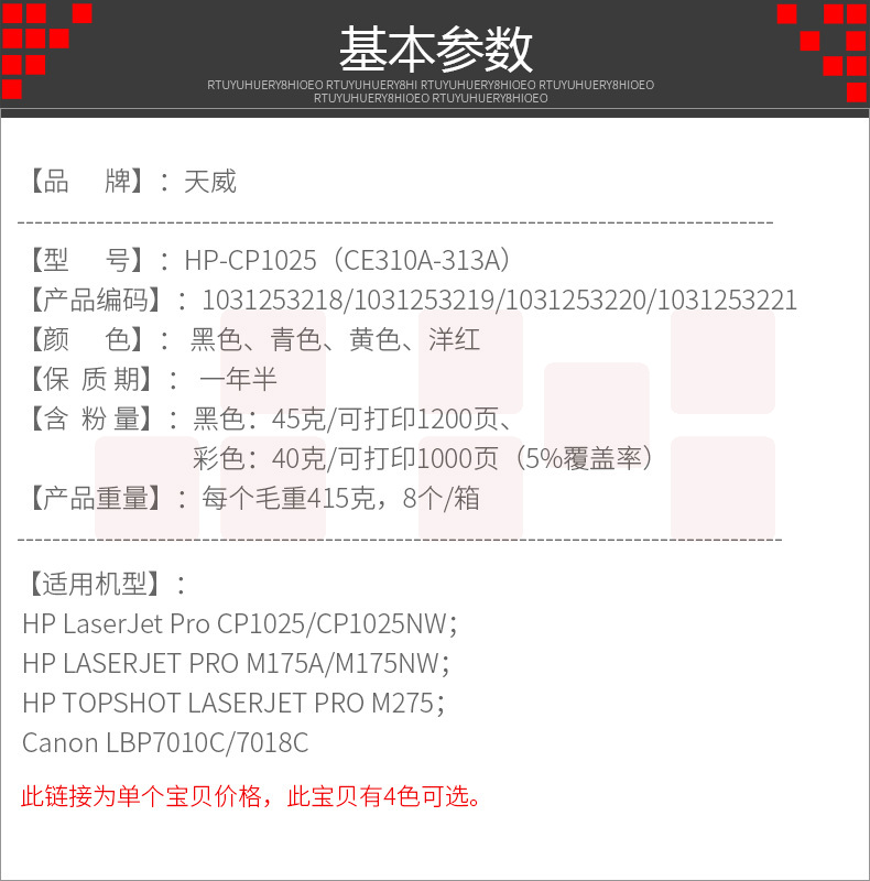 天威 CE310A硒鼓 适用惠普HP CP1025nw MFP M176n 177fw Canon LBP7010C CRG329 126A 130 CF350约1200页 新老包装随机发